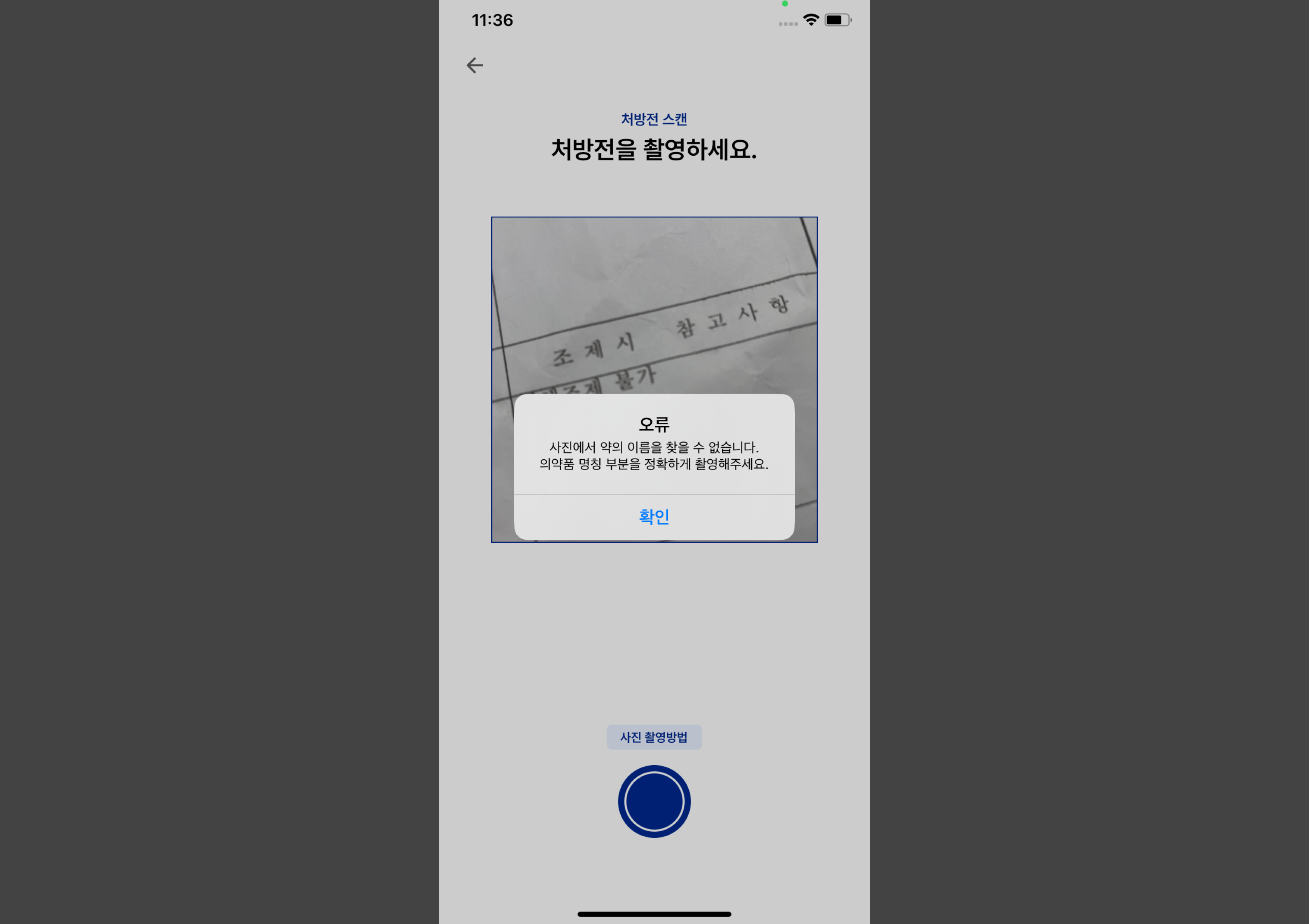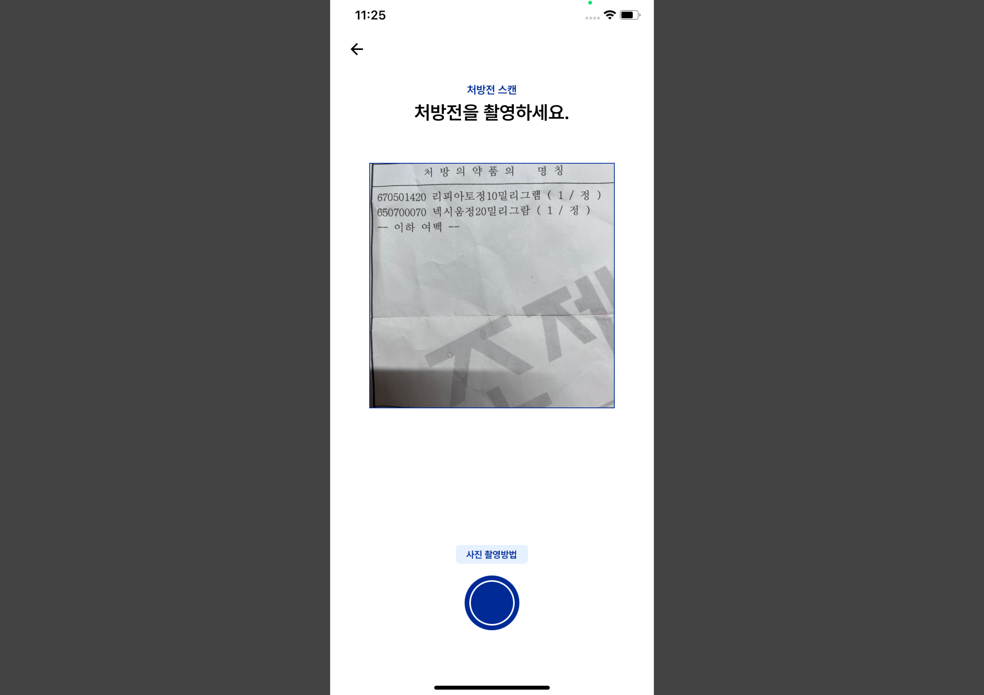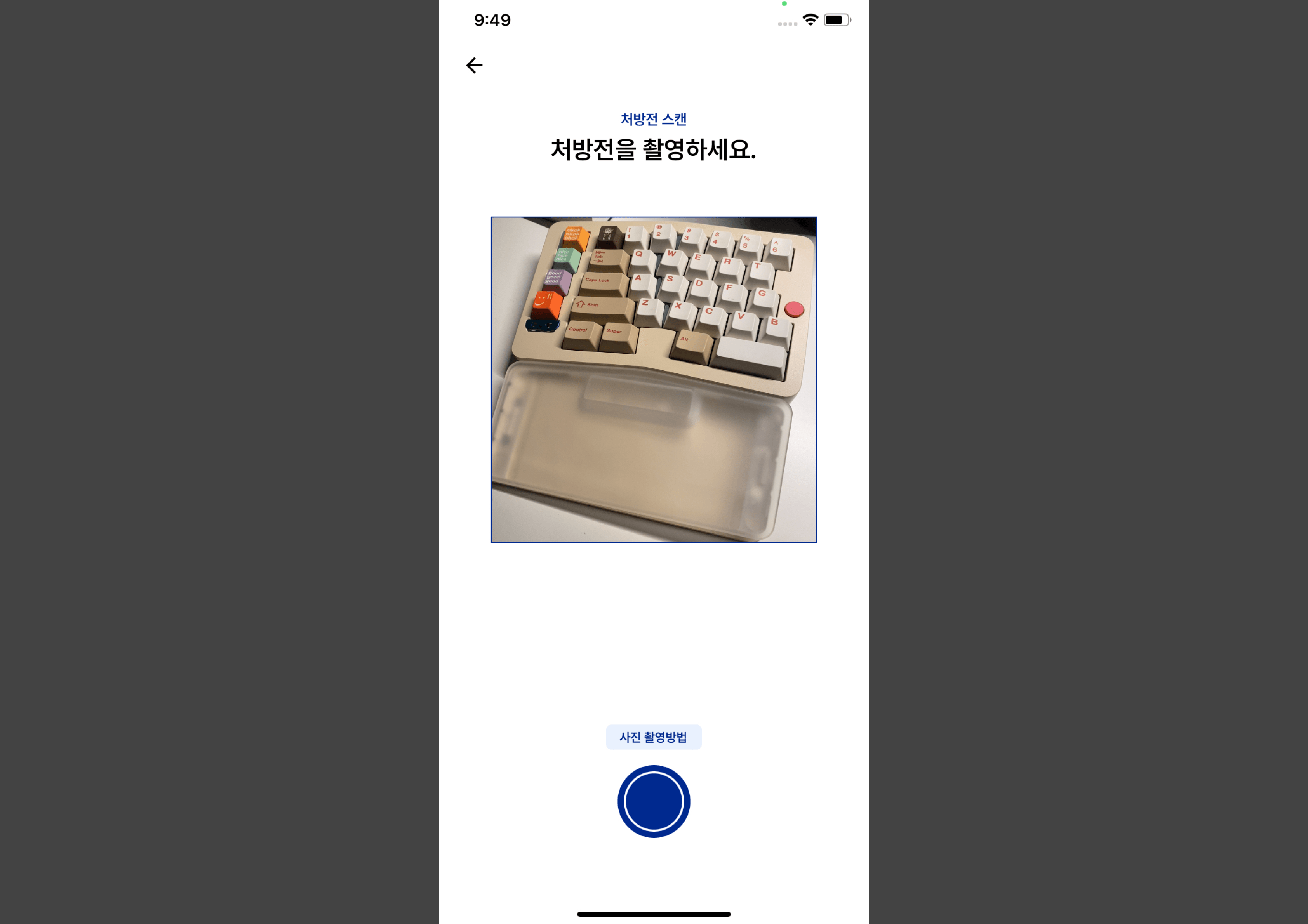 아래와 같은 UI로 사용자가 처방전의 의약품 명칭 부분을 촬영할 수 있도록 구현하였다.
